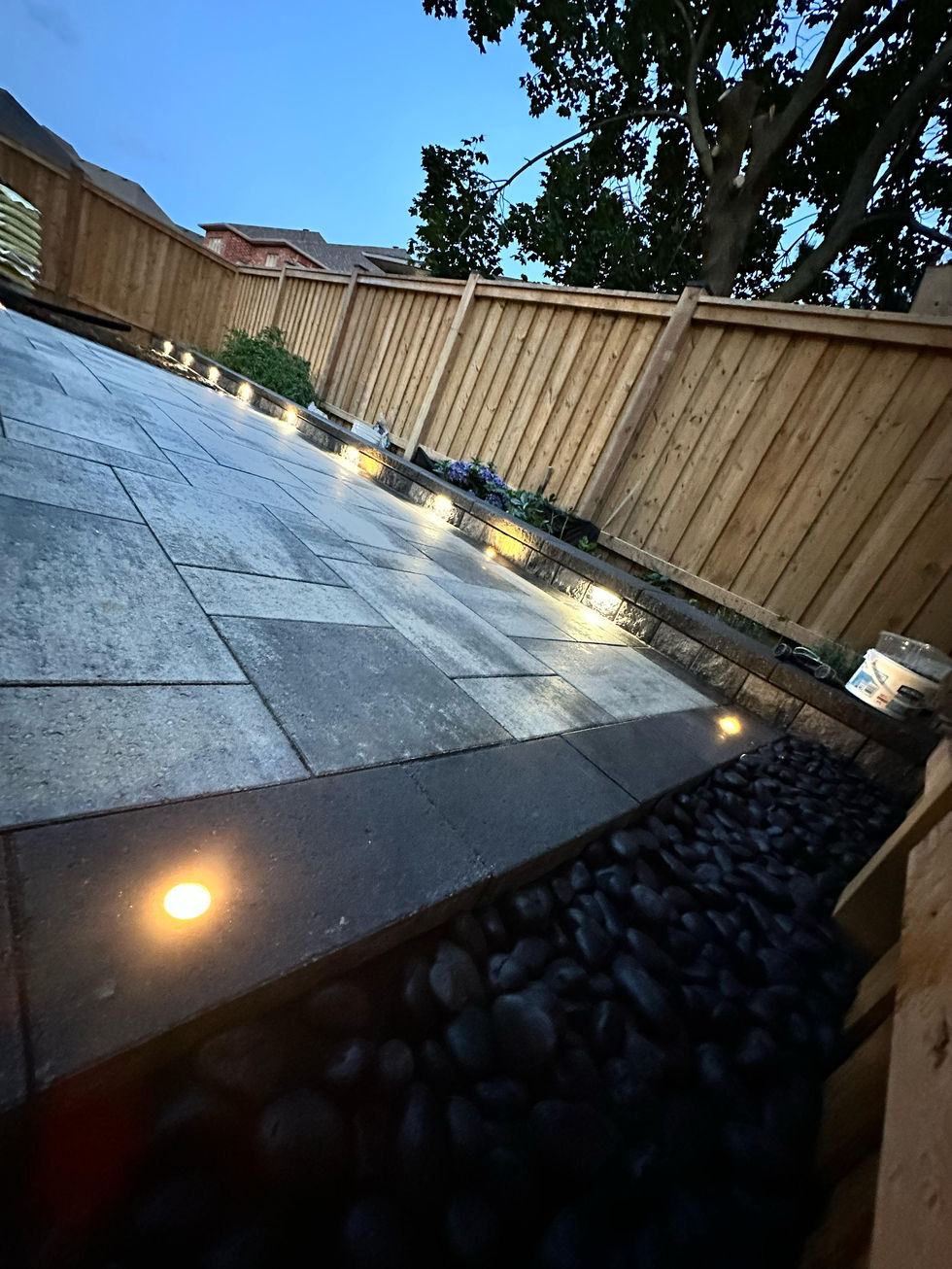 A collection of modern backyard patios with seating areas, wooden fences, and artificial grass, perfect for residential projects.